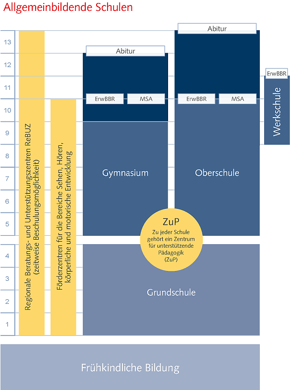 Bis zur Sekundarstufe I besuchen die meisten Schülerinnen und Schüler in Bremen zunächst für vier Jahre eine Grundschule und anschließend eine Oberschule oder ein Gymnasium. In beiden Schularten können alle allgemeinbildenden Schulabschlüsse erreicht werden. Das Gymnasium ermöglicht das Abitur nach 12 Jahren, die Oberschule nach 13 Jahren, einige Oberschulen zusätzlich auch nach 12 Jahren. Nach der Sekundarstufe I können Schülerinnen und Schüler ihren Bildungsweg in einer Gymnasialen Oberstufe oder in den berufsbildenden Schulen fortsetzen - je nach Bildungsgang ebenfalls bis zum Abitur.