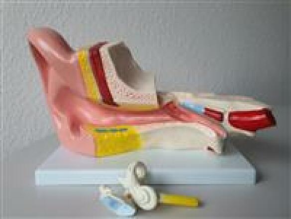 Das Modell zeigt eine 3-fach vergrößerte Ansicht der Strukturen Außenohr, Mittelohr und Innenohr. Das Trommelfell mit Innenohr ist als weiche Silikonmasse zu entnehmen.