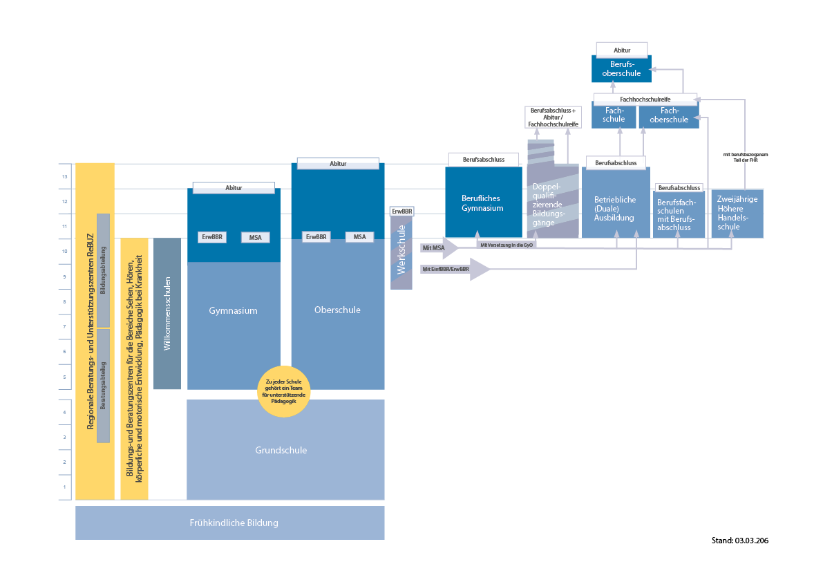 Die Schularten Oberschule und Gymnasium führen beide parallel und auf je eigenen Wegen zu den selben Zielen. Alle allgemeinbildenden Schulabschlüsse – von der Berufsbildungsreife über den Mittleren Schulabschluss bis hin zum Abitur nach dem 12. oder 13. Jahrgang – sind in den beiden Schularten möglich, alle Möglichkeiten der Förderung, sowohl für die Schwächeren als auch für die Stärkeren, werden hier genutzt.