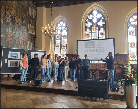 Am 28.05.2025, zur Eröffnung der Bremer Welterbetage, wurde das Projekt in der oberen Rathaushalle vorgestellt und präsentiert. Die Schüler:innen teilten ihre Sicht auf das Bremer Welterbe und das Thema Demokratie(geschichte) mit und stellten in diesem Rahmen die künstlerischen Arbeiten vor, die sie während ihrer Welterebetagung gestaltet haben.
