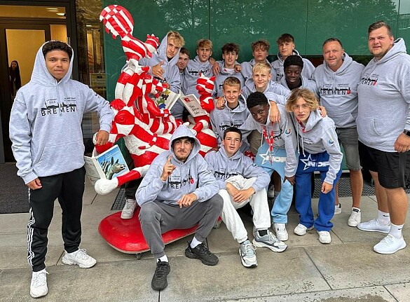 Den Bundessieg im Fußball, Jungen, WK II, erkickte das Team des Gymnasiums Links der Weser. Im Finale schlug das Bremer Team das der Sportschule im Olympiapark aus Berlin mit 2:1. Eine sensationelle Leistung! Die Kicker vom linken Weserufer konnten während des gesamten Turniers mit Teamgeist, Ausdauer, Spielwitz und Toren überzeugen. Die Freude vor Ort war riesig. „Deutscher Meister wird nur das beste Team“, so die Trainer Markus Fila und Niclas Bergmann. Maximilian Otto und Sven Meineke, Leiter der Eliteschule des Fußballs am Gymnasium links der Weser, zeigten sich absolut zufrieden: „Dass wir mit allen Mannschaften im oberen Tableau gespielt haben ist herausragend! Auch das Verhalten außerhalb des Platzes war mehr als vorzeigbar und eines Siegers würdig! Insgesamt zeigten die Teams im Bundesfinale ein ganz tolles Niveau. Für uns abgerundet mit einem überaus verdienten Sieg im Finale.“