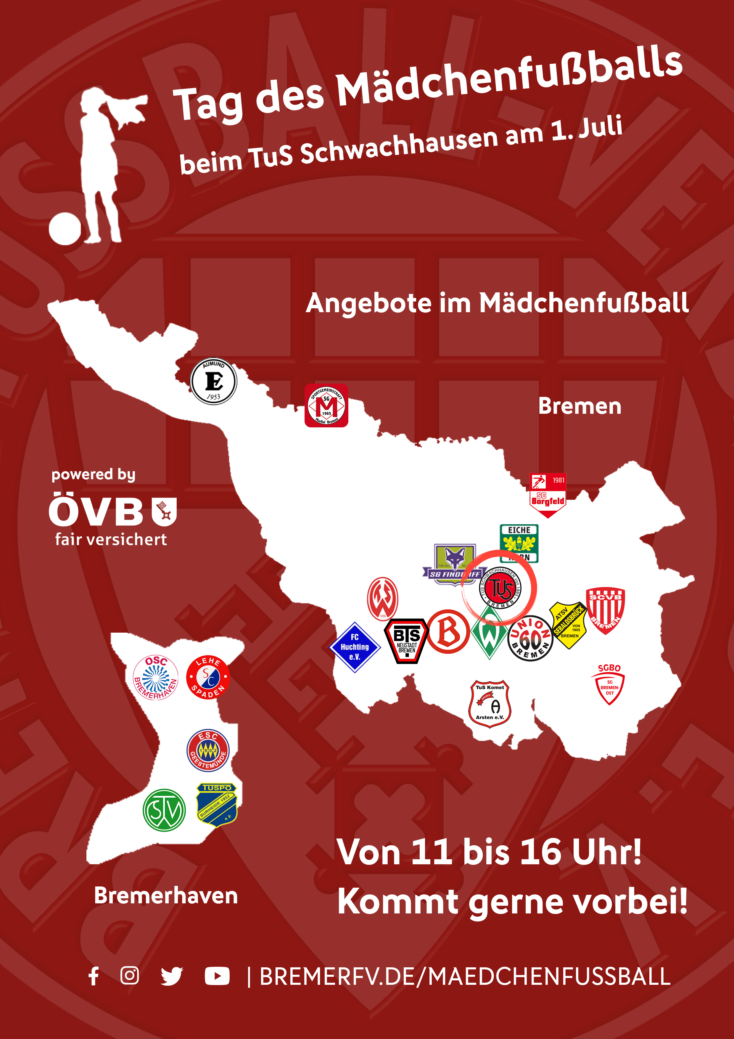 Der Bremer Fußballverband (BFV) organisiert für den 1. Juli, 11 bis 16 Uhr, den Tag des Mädchenfußballs auf der Anlage des TuS Schwachhausen, Konrad-Adenauer-Allee.